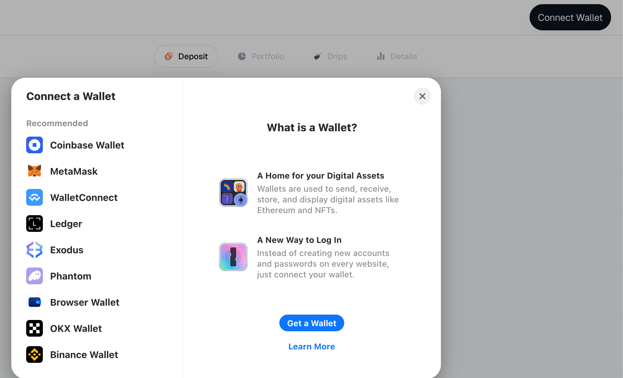 When you click on the Connect Wallet button on the top-right corner of the page, you can see a pop-up window of the wallets currently supported.