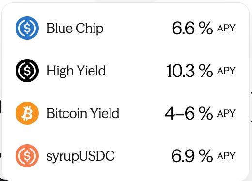 They also offer a Open Access version where you can earn up 6.9% APY yield, distributed in the form of syrupUSDC tokens. When you compare to the other types of yield for institutions, it’s pretty decent yield.